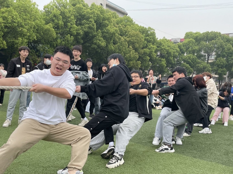 活动宣布开始后,整个操场顿时沸腾起来,各班同学都积极发扬团结协作精神为拔河比赛作准备。一声令下,参赛双方队员紧握绳子,大家都铆足了劲向后拉,一旁的同学们也情绪高涨,加油声、鼓掌声此起彼伏;运动会中最具挑战的是第二项比赛
